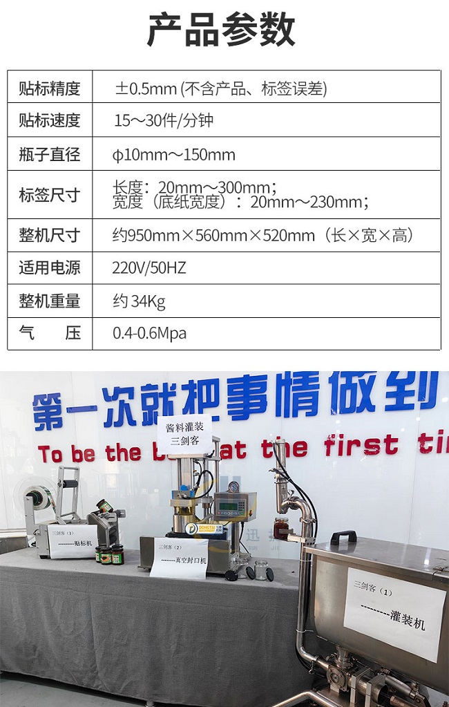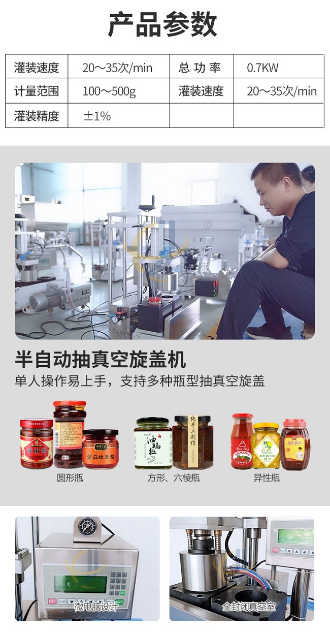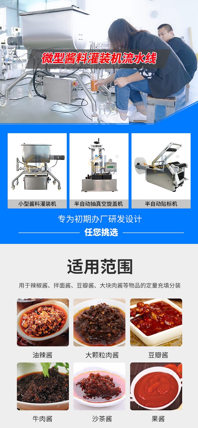 我公司新研發(fā)小型醬料灌裝生產(chǎn)線,包含三款小設(shè)備,小型醬料灌裝機(jī)、半自動(dòng)抽真空旋蓋機(jī)、半自動(dòng)貼標(biāo)機(jī)、該小型醬料生產(chǎn)線專為初期辦廠研發(fā)設(shè)計(jì),適用于辣椒醬、拌面醬、豆瓣醬、大塊醬等醬料的定量灌裝,該產(chǎn)品支持定制,選用306不銹鋼材質(zhì),灌裝精度高,防止滴漏,選用plc觸屏智能控制,防滴漏防拉絲,突破傳統(tǒng)的灌裝方式,可根據(jù)瓶子高度調(diào)整灌裝頭高度,采用防滴漏設(shè)計(jì),灌裝時(shí)不滴不漏。