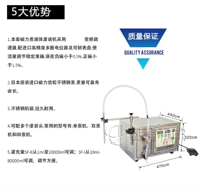主要用途:可灌充絕大類(lèi)型的液體,包括高粘稠度的液體。如:各種藥劑、化學(xué)品、化妝品、食品等無(wú)顆粒狀液體;灌裝精度高,適合實(shí)驗(yàn)室用。